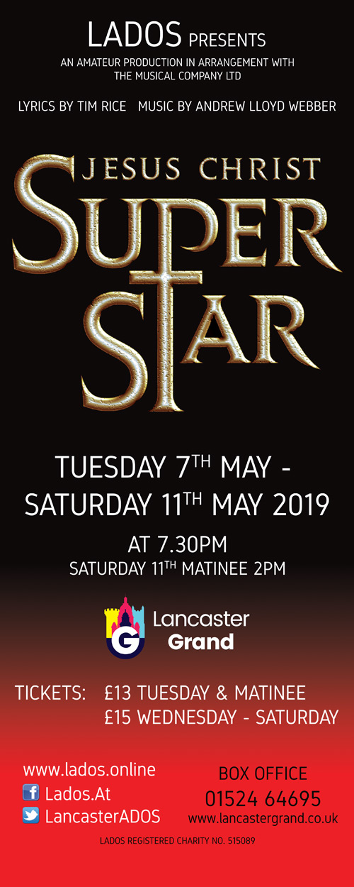With our 2019 production under the direction of Suzanne and Kevin Ward, take a moment to view all the cast and production details from our 1996 production at the Lancaster Grand and our 2002 production at Lancaster Priory both directed by Suzanne's mother Peggy Brierley with Roger Bradley as Jesus of Nazareth.